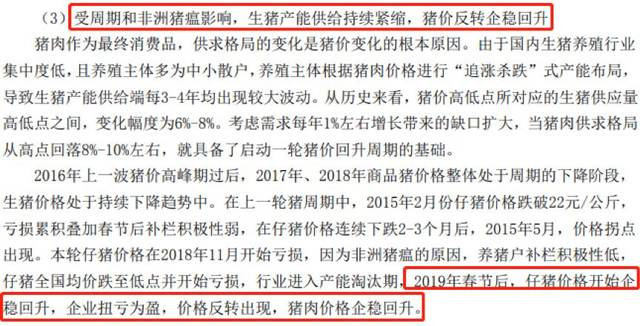 值得注意的是,2018年报中公司在进行行业发展情况分析时曾表示“2019年春节后,仔猪价格开始企稳回升,企业扭亏为盈,价格反转出现,猪肉价格企稳回升。”