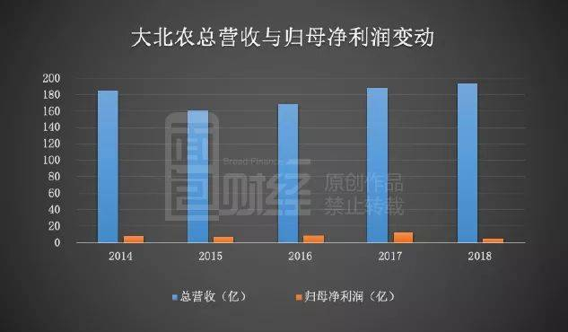 北大农主要产品为畜禽饲料、兽药疫苗、种猪与作物种子等。其中,饲料业务为公司最主要的收入来源,2018年该业务在公司总营收中的占比超过86%。2018年公司营收总额193.02亿,同比微增2.99%,但归母净利润5.07亿,同比下滑近六成。