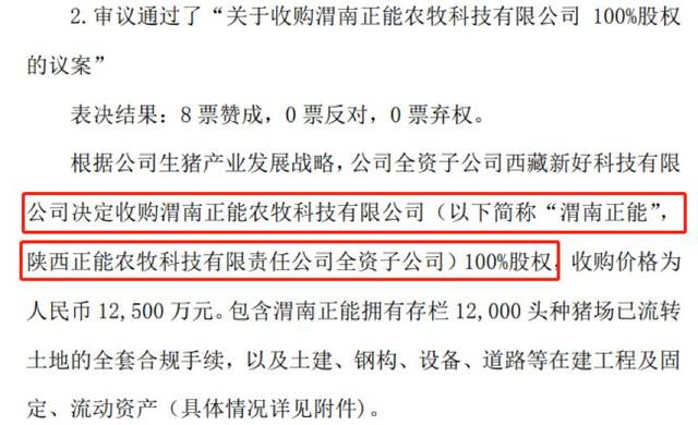 然而在同业上市公司新希望(000876.SZ)2019年7月5日发布的第八届董事会第二次会议决议公告中,相关内容显示新希望将收购渭南正能100%股权。