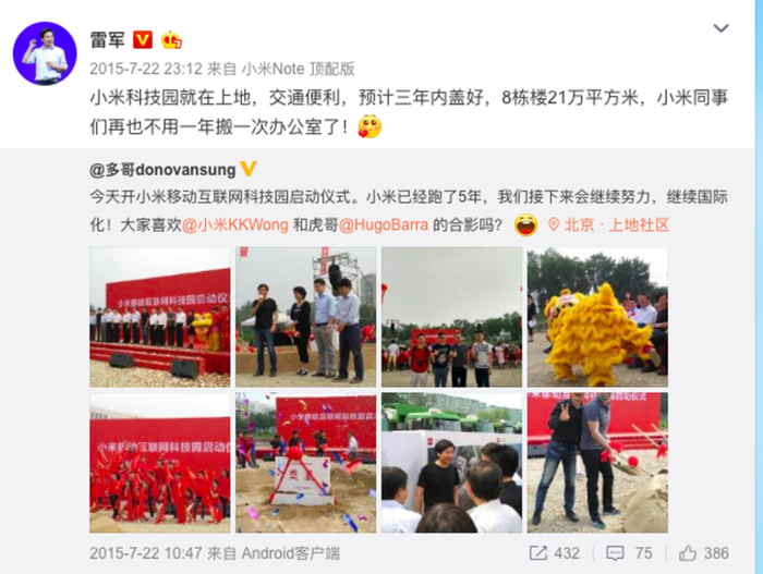 钛媒体了解到,小米科技园位于北京市海淀区的上地“后厂村”,2015年7月23日举行了科技园奠基启动仪式。科技园占地21万平方米,坐落于西二旗中路西侧,与联想、百度等产业园相隔不远。当时,雷军发微博用的手机还是小米Note顶配版,如今已经迭代到了CC9。