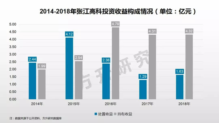投资收益一般来自于持有公司股权获得的红利或者股权出售取得收益两种方式。按照收益方式不同将投资收益细分为处置收益和持有收益两部分发现:张江高科2014、2015年处置收益高于持有投资收益;但是从2016年开始,持有投资收益远远高于处置收益,2017年、2018年持有收益分别高出处置收益50%、43%。也就是说从2016年开始张江高科投资收益结构发生了变化,从以售卖持有的股权获得收益为主转为以长期持有股权取得收益为主。