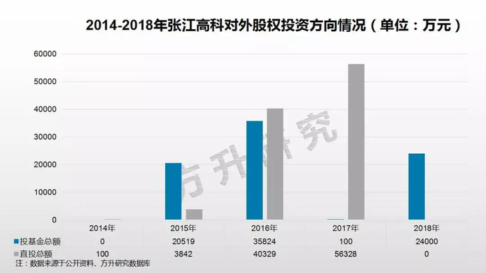 从投资方向分析:通过对张江高科对外股权投资的公司类型进行整理发现,张江高科近几年直接投向实体企业(即直投)的金额和投向基金(即FOF)的金额发生了巨大的变化。2014-2018年直投的金额不断减少,投向基金的金额直线攀升,其中,2016年是一个重要的转折点,2016年之前对外股权投资主要投向实体企业,但是2017年、2018年几乎全部的对外股权投资额投向了基金。