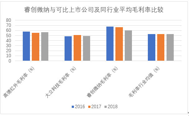 与同行业可以公司相比,睿创微纳毛利率优势明显。2018年,同行业可比公司高德红外与大立科技的毛利率分别为42.13%与47.98%,远低于睿创微纳;对2017年和2016年来说亦是如此。