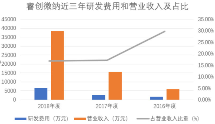 得益于管理团队对所属技术领域多年的积淀和精深,睿创微纳对研发的重视程度便可想而知。近几年,睿创维纳近年来不断加大研发投入:2016-2018年公司研发费用分别为 1794 万元、2676 万元、6508 万元,2017年与 2018 年同比增长率分别为 49.1%,143.2%。与可比上市公司高德红外和大立科技相比,随着公司营收迅速增长,公司研发投入规模已不逊色于这两家公司。