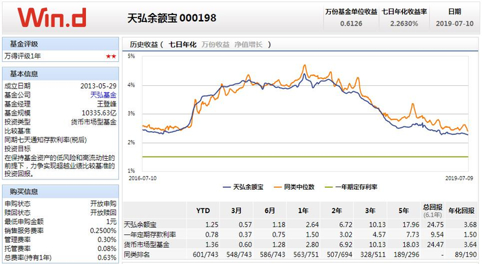 Wind统计数据显示,截至7月10日,天弘余额宝货币基金的7日年化收益率为2.263%,刷新该产品2013年5月29日成立以来的历史新低,低于全市场货币型基金7日年化收益率中位数2.298%。