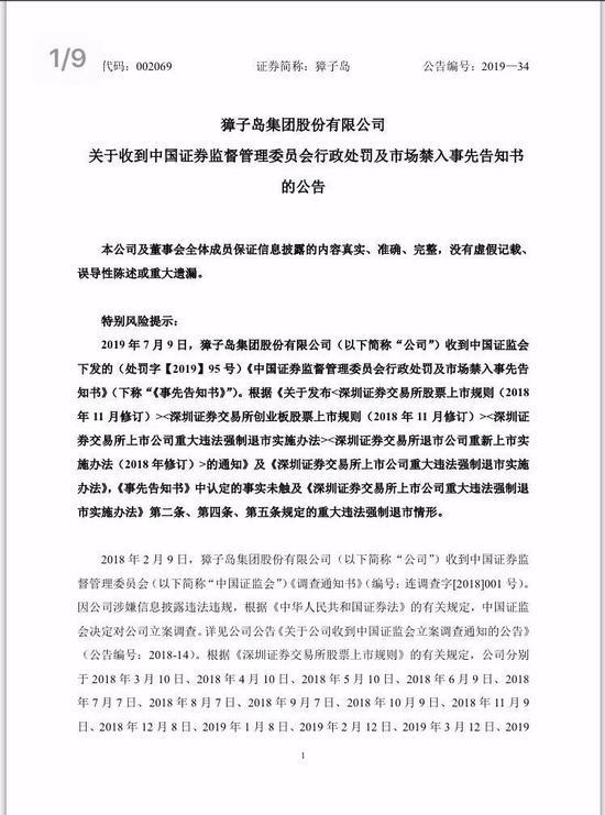 7月10日晚间,獐子岛公告称,由于涉嫌财务造假、内部控制存在重大缺陷和涉嫌未及时披露信息等情况,收到证监会行政处罚及市场事先告知书。
