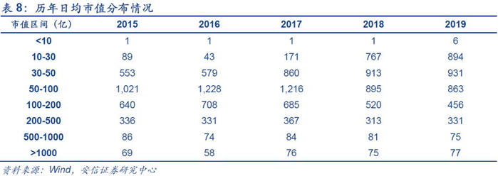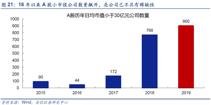 关于并购重组放松是否会带来“壳资源”价值大幅提升,我们认为可能性偏低。首先,目前科创板已经试行注册制,且科创板的借壳也是注册制,可以看到去年以来退市制度也正在加速完善,不能排除注册制以后向主板推广;其次,近几年A股小市值公司的数量愈发增多,“壳资源”本身并不稀缺;最后,监管的态度也十分明确,完善并购重组并不是放任恶意“炒壳”,从严监管下,绩差股鸡犬升天的情况很难再现。