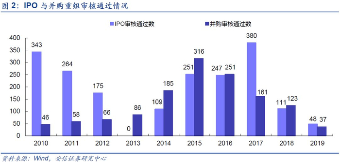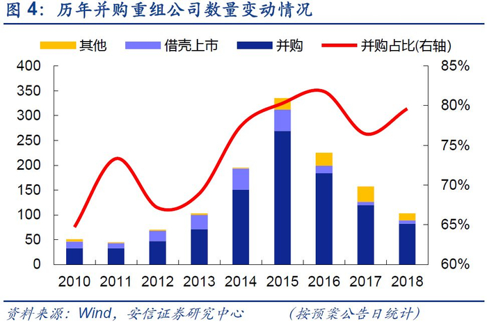 在政策“调整收紧阶段”,为了引导资金“脱虚向实”,IPO受到政策鼓励支持,17年A股IPO数量规模双双回升,而并购重组则受到全面压制,数量规模均大幅萎缩。2015年发布并购重组相关预案的公司有335家,到2018年仅103家。另一方面,随着IPO堰塞湖的纾解和监管趋严,借壳上市的数量和比例也在持续下滑。