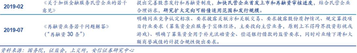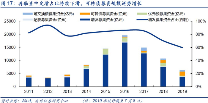 2019年政策持续加持并购重组与再融资,直接融资越发受到重视。今年2月《关于加强金融服务民营企业的若干意见》提出要“加快民营企业首发上市和再融资审核进度”“ 研究扩大定向可转债适用范围和发行规模”。7月5日,证监会发布《再融资业务若干问题解答》,通过30条问答明确了再融资审核业务中的具体问题,供各再融资申请人和相关中介机构对照适用,这进一步增加了再融资审核工作的透明度。在系列政策呵护下,再融资渠道有望进一步扩展,(定向)可转债、优先股、可交换债等新型再融资工具有望获得现阶段政策的大力推动。另一方面,以定增为代表的传统主流再融资工具,未来也不排除获得政策放松的机会。