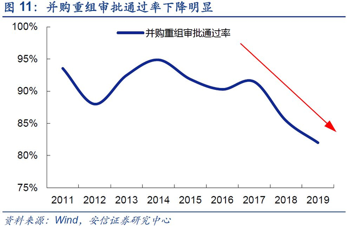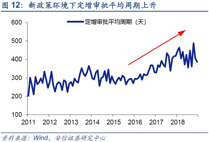 政策对并购重组的压制主要分为两部分:一是对于并购重组的审批趋于严格,持续遏制“跟风式重组”、“盲目跨界重组”,尤其是影视、游戏、互金、VR等方向的并购重组。并购重组审批通过率近两年已下滑了近10%。二是对于定增的限制,一方面定增的发行折价率在定价基准日政策调整后大幅下滑,此前巨大的套利空间不复存在;另一方面新政策环境下定增审批的平均周期也在持续攀升,从14-15年的平均296天上升至18年的平均416天。多重限制下参与定增的资金热情大不如前。