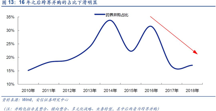 政策对盲目跨界、转型、忽悠投资者的跨界并购类型的抑制也同样效果明显,我们统计发现,历年并购中跨界并购的占比已经从16年30%以上降至18%以下。更多的并购开始集中于整合行业产业链,提升公司竞争力。