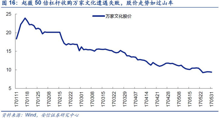 伴随并购重组的恶意炒壳、内幕交易、操纵市场等违法违规行为。例如16年年底赵薇试图通过50倍杠杆收购万家文化29.13%的股权,该收购案最终因为信息披露违法而夭折,股票走势也经历了过山车。