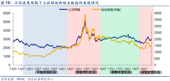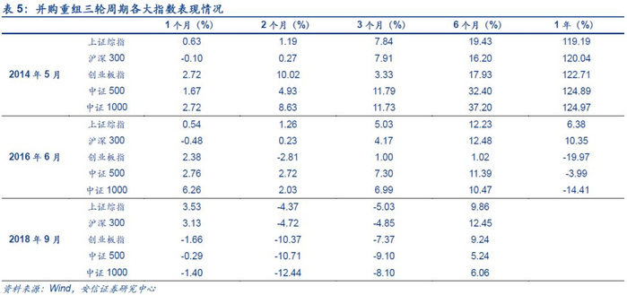 纵观历次政策周期中上证综指和创业板指的涨跌变化,可以发现并购重组与再融资政策的宽松对股指上涨的刺激作用。2011年8月,证监会首次明确“借壳上市”的认定标准,开始了政策周期中的“初始发展阶段”,在此阶段,上证综指实现了探底与止跌,而创业板指则从12年12月开始一路上涨,走出独立行情。2014年5月“新国九条”的发布标志着政策周期进入“鼓励宽松阶段”上证综指和创业板指双双迎来大涨,特别是创业板指在短短13个月内暴涨211%,并购重组的政策刺激不容忽视。2016年6月“最严借壳标准”出台,标志着政策周期进入“调整收缩阶段”,与之前两个阶段不同的是,两大股指的涨幅在该阶段受到了不小的抑制,特别是创业板指甚至首次出现了持续弱势的表现,最后跌至14年牛市开启前的水平。随着18年下半年后政策方向的再次调整,两大指数也随之触底回升。在新的“谨慎放宽阶段”,市场迎来温和上涨的环境,与以往不同的是,这次上证综指与创业板指的走势分化并不显著,两者涨幅较为接近,此前市场的一大共识,即“并购重组利好中小市值,利好创业板”正在被打破。我们认为很关键的原因是创业板在14-16年的并购潮中积累了大额商誉造成了较大的减值压力而新一轮的并购重组还未放量。
