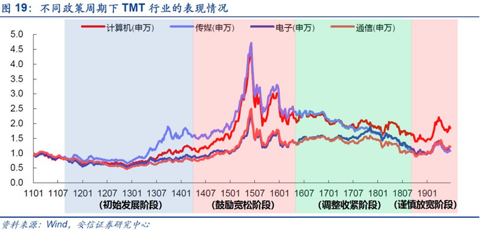 并购重组与再融资政策对创业板的影响比上证综指大,特别是对并购重组较多的TMT行业的影响应该最为显著。我们的研究发现,各个阶段中,电子与通信行业的表现较为接近,而计算机和传媒行业则分别走出了独立行情。早在2013年“初始发展阶段”,传媒行业就在第一波并购重组浪潮涨崛起,而进入到“鼓励宽松阶段”后计算机行业收获最为剧烈的涨幅,以“互联网金融”为噱头的并购重组风靡一时。进入“调整收紧阶段”后,影视、游戏、互金、VR四个方向的并购重组受到严控,传媒和计算机行业遭受政策负面冲击。从17年二季度以来,A股对“硬科技”的偏好越来越明显,计算机、半导体受到市场认可,而传媒影视等行业“硬科技”含量不足,在“脱虚入实”的时代大背景下,相关行业的并购重组仍未放开。