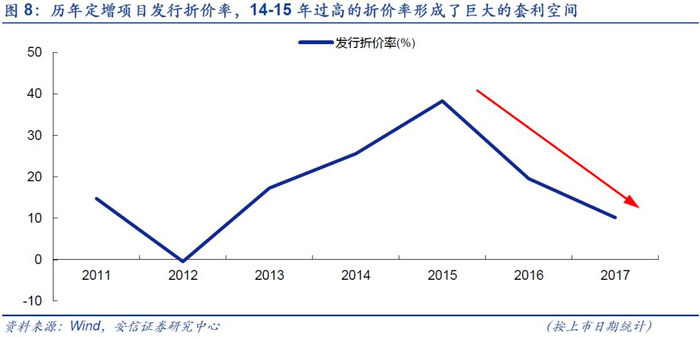 定增机制是市场热衷并购的另一大原因。长期以来,由于不甚合理的定增定价机制,使得定增的发行折价率过高,2015年这一折价率的平均水平甚至高达38%。为定增资金形成了巨大的套利空间,吸引了大量资金参与定增套利,为上市公司的并购提供大量资金支持。定增资金的套利行为,二级市场炒壳行为不利于资金“脱虚向实”,在供给侧改革的大背景下,成为了政策调整的重点。