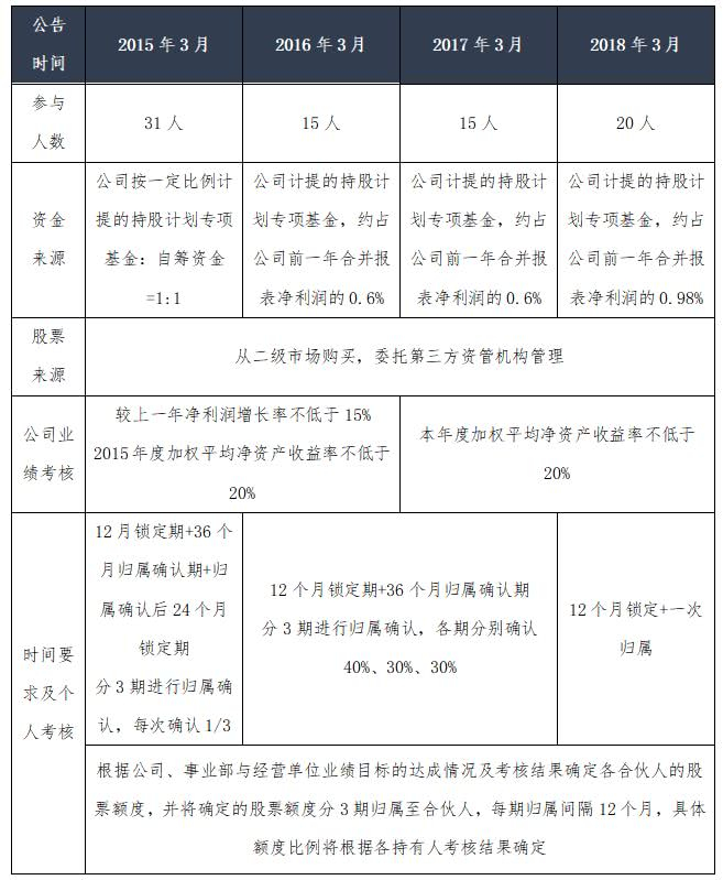 截止2018年底,美的集团共推出四期核心管理团队持股计划(即合伙人计划)。(见表3)