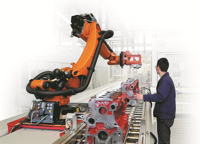 如今,走进全柴任何一个生产车间,都能看到工人与机器人共同在生产线上忙碌的景象。“MES”生产制造信息化控制管理系统已广泛应用于生产全过程,关键部位自动化检测、现场在线抓取数据、生产过程监控、工艺技术不足自动报警、物料自动呼叫等新技术层出不穷,实现质量可追溯。在全新的国六发动机自动化生产车间,记者看到生产线上工人并不多,缸盖上线、曲轴上线,机器人抓取、涂胶、拧紧,智能化几乎无所不能。据全柴动力股份有限公司副总经理汪志义介绍,H30国六发动机与国五发动机相比,具有污染小、油耗低的特点,PM值可降低90%以上。近3年来,全柴集团共投入研发费用约3亿元,建设国家级企业技术中心,搭建了国内一流的新产品试验室,引进AVL发动机试验台架、NVH试验室、整车转毂试验室等,具备柴油机、汽油机、双燃料发动机以及整车排放和标定试验能力。