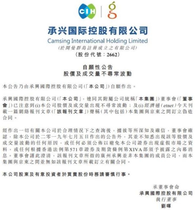 7月9日傍晚,港股承兴国际在港交所发布澄清公告称,有媒体称集团与京东之间订立伪造合同,董事会就此澄清,广州承兴并非集团的成员公司,而集团与京东之间并未如媒体报道提到的订立有关合同。