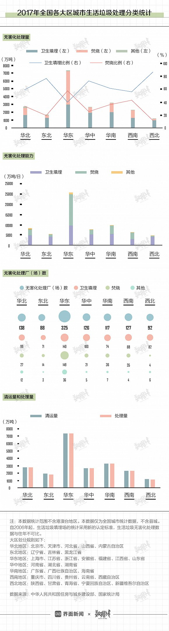 具体到全国各大区,华东地区产生的城市生活垃圾最多,垃圾处理能力也最强。与此同时,华东地区也是全国唯一一个以焚烧为主要处理方式的大区。西北地区和东北地区的垃圾填埋比例排名前二,分别为86.6%和76.4%。