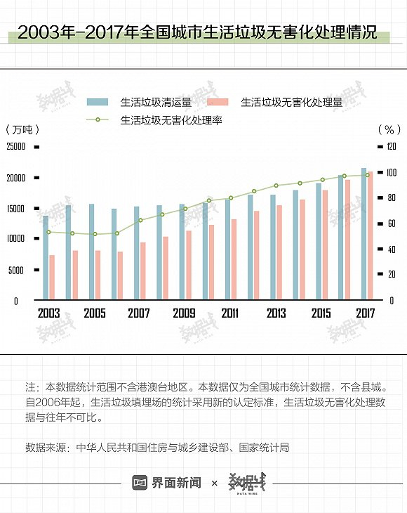 2003年以来,中国城市生活垃圾的无害化处理率逐年上升,由2003年的53.2%上升至2017年的97.7%。2017年全国产生的2.15亿吨城市生活垃圾,基本都能做到无害化处理。