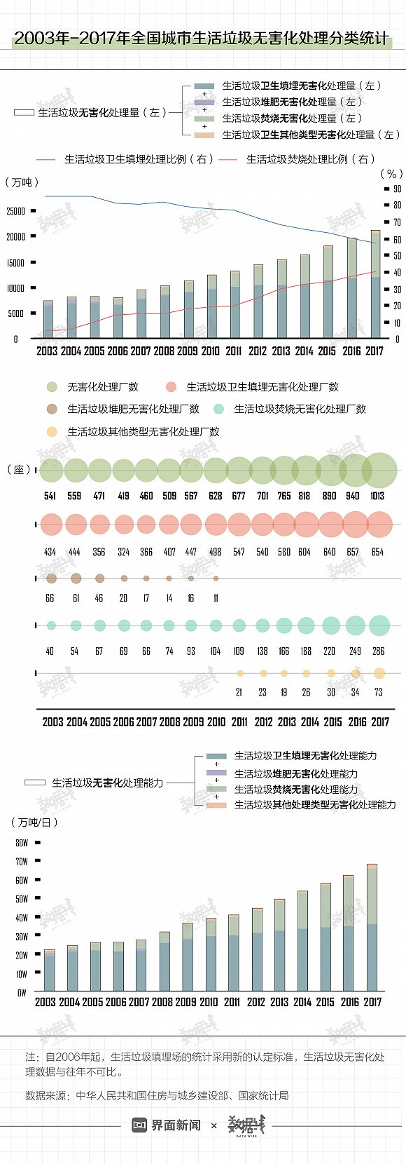 虽然填埋的垃圾占了大多数,但烧掉的垃圾也越来越多。2003年以来,中国城市生活垃圾的焚烧处理比例逐年上升,由2003年的4.6%上升至2017年的40.2%。