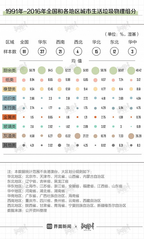 在日常城市生活中,哪种垃圾最多?根据重庆大学王小铭教授和魏潇潇等学者的分析,1991年至2016年的历史数据显示厨余类比重最大,全国层面的占比高达56.8%。具体到各大区,由于能源结构、经济水平和生活习惯的差异,各地垃圾组分比例不一,但厨余类均为占比最高的生活垃圾类型。