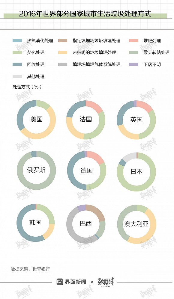 在城市生活垃圾处理方式上,各个国家的情况也不尽相同。总体而言,填埋、堆肥、焚化和回收是国际主流的垃圾处理方式。美国、法国、英国、德国等发达国家每年约有20%至50%的城市生活垃圾会被回收处理,如德国和韩国的垃圾回收处理比例即高达48%和58%。