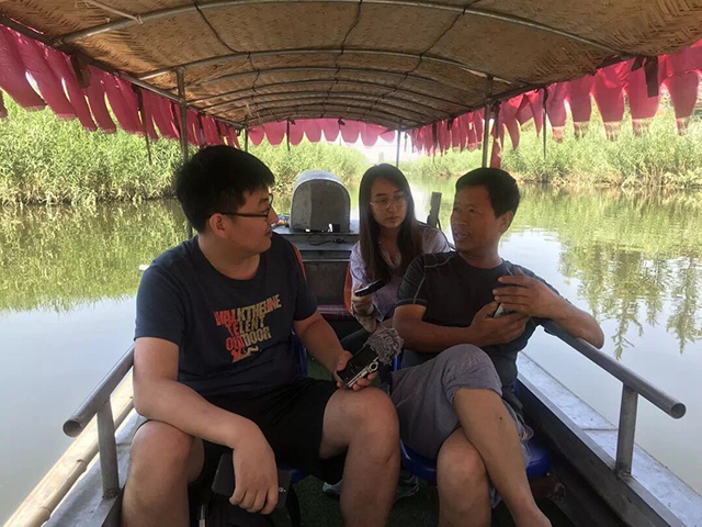 记者在船上和邵小欢交谈