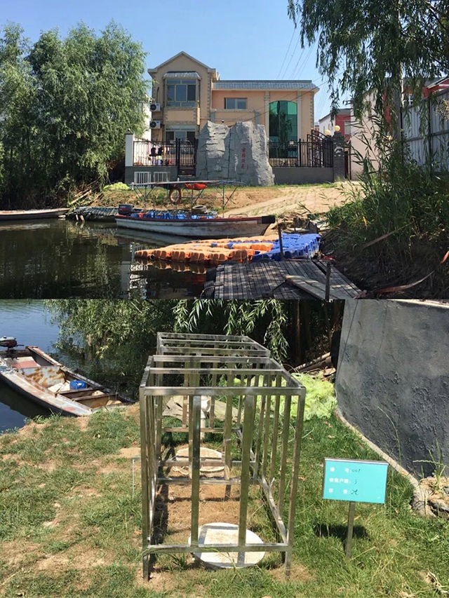 邵庄子村的邵章乐家就位于淀边,在他家门前新建的两个污水桶被编为001号。