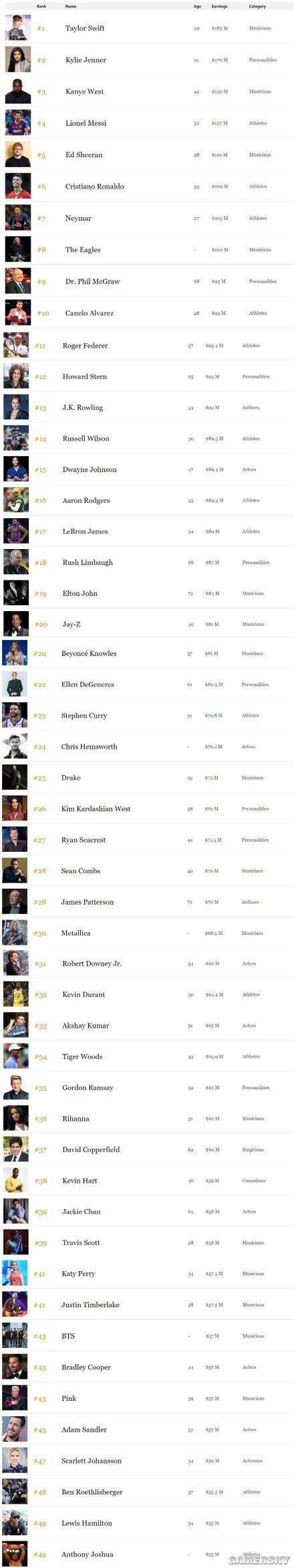2019福布斯名人榜:泰勒斯威夫特1.85亿美元登顶