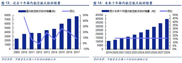 根据中国有色金属工业协会钛锆铪分会数据,2009~2017年的国内航空航天用钛材销量的年复合增长率为16%,同时考虑到国内目前航空航天用钛材占比远低于全球范围内航空航天用钛材占钛材总需求的50%的比例,我们可以认为未来10年的复合增长率保持不变为16%。
