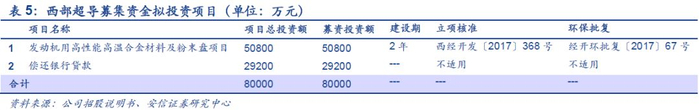 发行人共募投项目8亿元,其中5.08亿元用于发动机用高性能高温合金材料及粉末盘项目;2.92亿元用于偿还银行贷款。