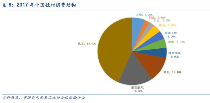 我国航空用钛材市场还存在较大潜力,随着国内军用飞机的升级换代和新增型号列装,以及商用飞机通过适航认证后的产能释放,未来高端钛合金材料市场空间广阔。中国钛材消费结构与全球相比最主要的差别在航空领域,全球范围内航空用钛材始终占据钛材总需求的50%左右,而国内航空用钛材的比例仅为16.3%。