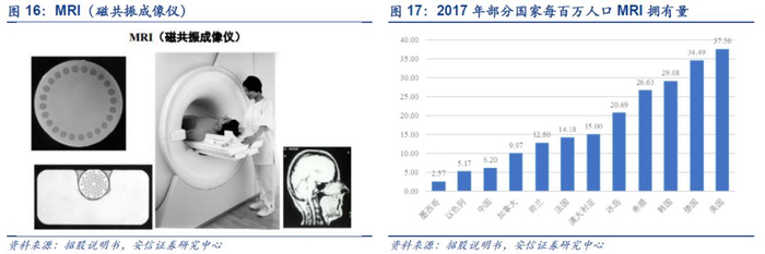 MRI设备需求由病人数量、临床使用人员和经济发展水平等因素所决定。根据智研咨询测算,我国每百万人口MRI的拥有量由2013年的3.3台增加到2017年的6.2台。与欧美日等发达国家相比,我国MRI设备的普及程度处于较低水平。MRI设备的医院、人口的平均拥有量较低,无法满足国内市场需求,未来需求将保持增长。我们认为,国内MRI设备未来增长空间来自于国际企业在大陆设厂生产以及国产核磁共振设备开始逐步实现进口替代。