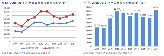 供给层面看,钛工业出现结构性产能过剩,航空用高端钛材供不应求,民用中低端钛材产能严重过剩。我国中国的钛工业始于上世纪五十年代。五十年代中期,开始钛及钛合金的探索研究;六十年代初,开始了钛的半工业化生产;六十年代中期,实现了海绵钛和钛材的批量化生产。当前中国海绵钛和钛加工材产量均位居世界第一。近十年,在国民经济高速增长的拉动下,中国钛工业整体呈增长趋势。2017年中国海绵钛产量达到7.29万吨,中国钛材产量达到5.54万吨。需求层面看,2008年以来,中国钛材的需求总体上呈上升趋势,2011年钛材市场达到阶段性高点,其后国内钛材需求开始下滑。2017年,在高端化工、航空航天、船舶和电力等行业需求带动下,我国钛加工材需求创历史新高。