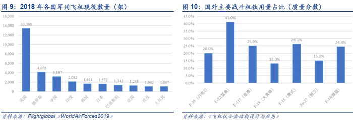军用航空钛材需求主要来自于2方面:我国军机数量增长,以及钛合金在军用飞机上的用量不断提升。钛合金是飞机和发动机的主要结构材料之一,主要用于飞机的起落架部件、机身的梁、框和紧固件等,发动机风扇、压气机、叶片、鼓筒、机匣、轴等,以及直升机桨毂、连接件。一方面,根据Flightglobal发布的《Worldairforces2019》,截至2018年末,我国拥有的各类军用飞机3,187架,排在俄罗斯之后,位居世界第三。目前中美空军战机数量差距较大,且随着近年来我国军用飞机的升级换代,未来几年中国军用飞机服役数目将呈现不断增长态势;另一方面,自20世纪60年代末以来,军用飞机的用钛量逐年增长,当前欧美设计的各种先进战斗机和轰炸机中钛合金用量已经稳定在20%以上,美国F-22战斗机用钛量高达41%。我们认为,军机数量增长以及新型战斗机用钛量不断提升,均将带动我国航空用钛材的市场需求。