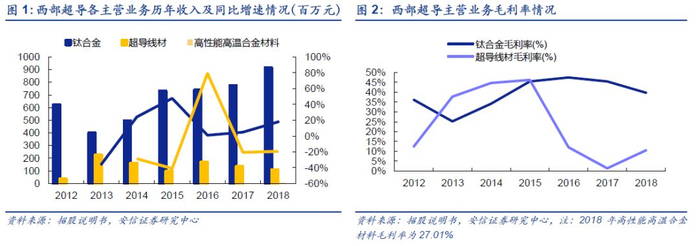 目前国内能够批量生产军用航空钛合金棒丝材的企业:西部超导、宝钛股份、湖南金天钛业科技有限公司。由于无法从公开途径获得金天钛业的相关数据,在此取宝钛股份进行对比。