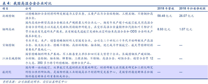 我国高温合金经过60多年发展,已经形成了比较先进,具有一定规模的生产基地,包括抚顺特殊钢股份有限公司、北京钢研高纳科技股份有限公司、宝钢特钢有限公司、攀钢集团江油长城特殊钢有限公司和中国航发北京航空材料研究院等。目前,在航空航天产业中,用量最大的变型高温合金,主要由抚顺特钢、宝钢特钢等公司提供。