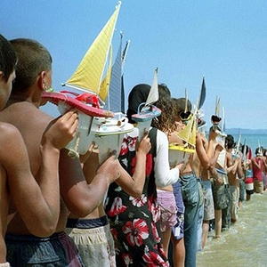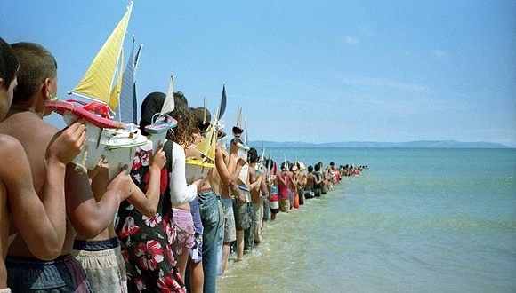 展览中不乏年代更近的作品,常驻墨西哥的比利时艺术家弗朗西斯·埃利斯(FrancisAlÿs)脱颖而出。他的视频作品中,来自摩洛哥丹吉尔和西班牙南部城市塔里法的孩子们排起长龙,一路延伸,探入海水中。