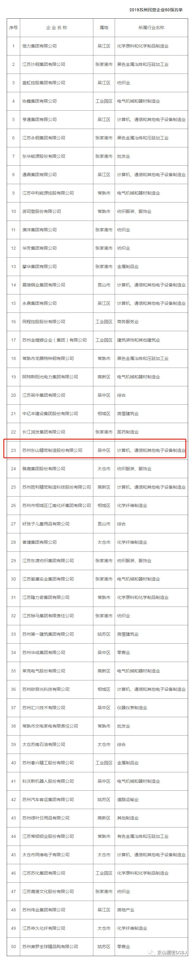 又讯:近日,由苏州市工商业联合会发布的“2019苏州民营企业50强”榜单,苏州东山精密制造股份有限公司荣获“2019苏州民营企业50强”第23位。