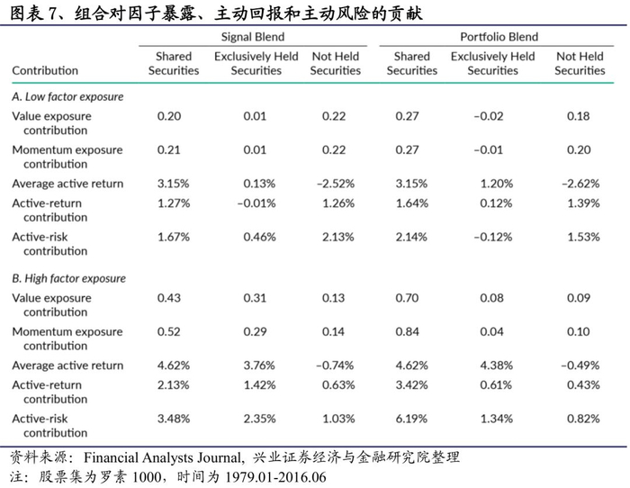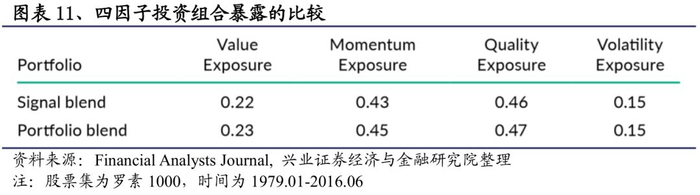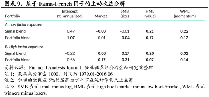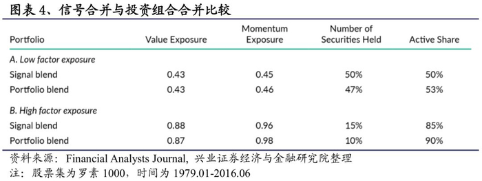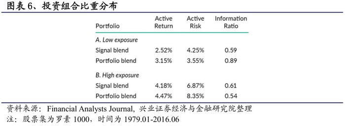 综上,在因子低暴露的案例中,投资组合合并产生了比信号合并更高的信息比率,并且这源于因子的相互作用,而不是源于非控制因子。