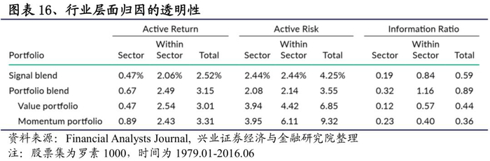 以两因子投资组合为例进行分析,图表15展示了投资组合合并中因子层面的业绩归因。投资组合合并的主动回报是价值组合与动量组合的平均值,其中动量组合比价值组合表现好一些(3.31% vs 3.01%)。由于价值和动量因子主动收益之间的负相关性,投资组合合并更好地分散了风险,从图表15可以看出,投资组合合并的主动风险的确低于单因子组合,因此也具有更高的信息比率。