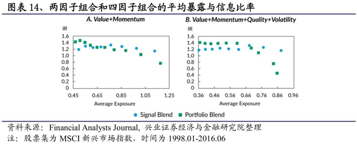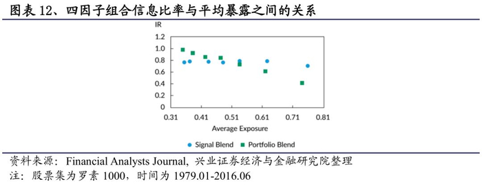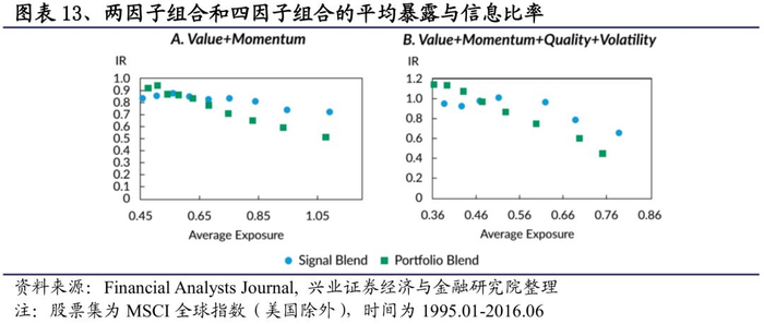 图表12展示了四因子组合信息比率与平均因子暴露之间的关系。总的来说,其与价值-动量组合中观察到的规律非常一致,即在因子暴露较低时,投资组合合并产生了比信号合并更高的信息比率;在因子暴露较高时,信号合并产生了比投资组合合并更高的信息比率。