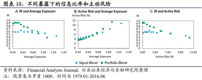 因为实现更高的暴露需要有更大的集中度,所以因子暴露和主动风险正相关。在中低水平的主动风险下,我们认为投资组合合并和信号合并表现相似;但是在高水平的主动风险下,信号合并会有更好的表现。在下一节中,本文用历史数据对这一推断进行了验证。