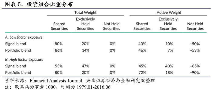 图表4的面板A表明,投资组合合并与信号合并方法构建的投资组合有几乎相同的因子暴露。另外,两个投资组合有相似的持有股票比例以及主动投资比例。