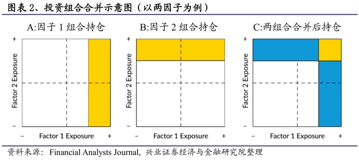 在投资组合合并方法中,为了实现相同的因子暴露,可以选择每个因子组合中排名前25%的股票。图表2中图A、图B的黄色区域分别展示了因子1、因子2组合的持仓,这些股票的持有权重都是原股票集中权重的4倍。两个单因子投资组合以相同的比例合并,合并之后组合的持仓展示在图表2的图C中。蓝色区域和黄色区域中股票的权重分别是原股票集中权重的2倍和4倍。