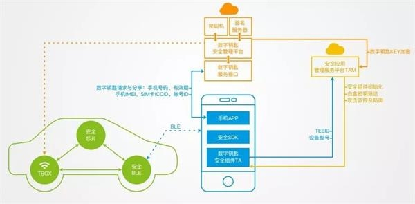 非车主使用时,可由车主生成、发放、销毁蓝牙钥匙给使用人;蓝牙钥匙功能具备独立APP,但是同车联网共用账号系统,车辆的绑定由TSP完成。蓝牙钥匙的分享是通过APP进行,与微信,短信等公共通信方式无关。销毁分享给别人的蓝牙钥匙,车主自行完成即可,车辆过户等销毁钥匙由后台客服完成。