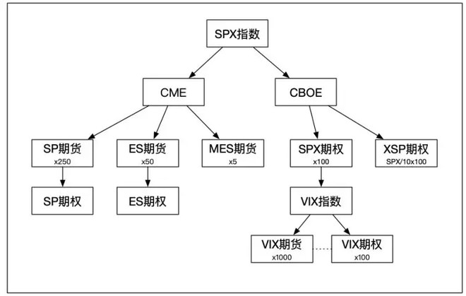 CBOE发行两个基于SPX指数的期权链:SPX期权、XSP期权,以及两个基于VIX指数的衍生品:VIX期货、VIX期权。