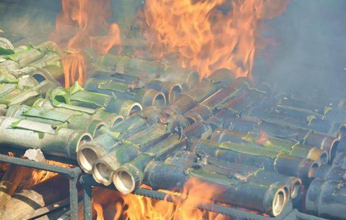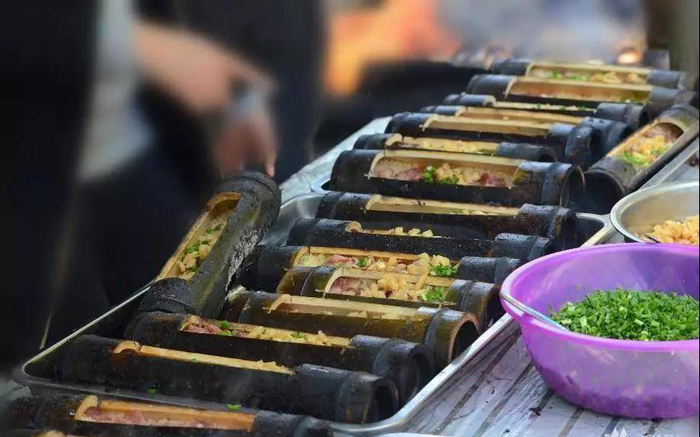 竹筒饭,用山兰稻(一种旱稻)冲的"香米"并配肉类为原料,放进新鲜的粉竹或山竹锯成的竹筒中,加适量的水,再用香蕉叶将竹筒口堵严,炭火中绿竹烤焦即可。劈开竹筒,米饭被竹膜所包,香软可口,有香竹之清香和米饭之芬芳。