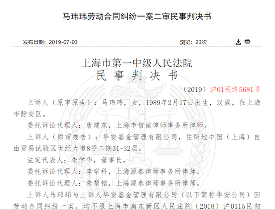 经仲裁,上海市浦东新区劳动人事争议仲裁委员会裁决华安基金支付马某2016年4月1日至2018年6月30日期间延时、双休日加班工资1131.95元,对马某其余请求不予支持。华安基金未对裁决结果提起上诉。